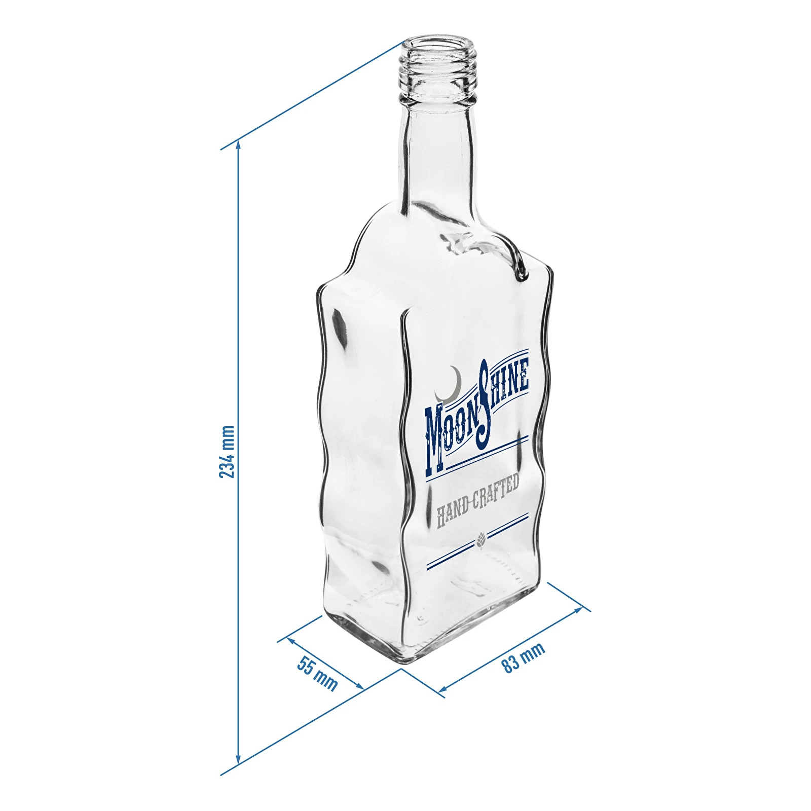 Kolejna, dekoracyjna wersja butelki Klasztornej - wykonanej z grubego, solidnego szkła. Butelka o ciekawym kształcie, jeszcze bardziej zachwyca swoim wyglądem poprzez trwale wykonany dwukolorowy nadruk, który nie ściera się w trakcie mycia i używania butelki. Butelka Klasztorna z nadrukiem dwukolorowym Moonshine idealnie pasuje do alkoholi przygotowanych w zaciszu domowym.